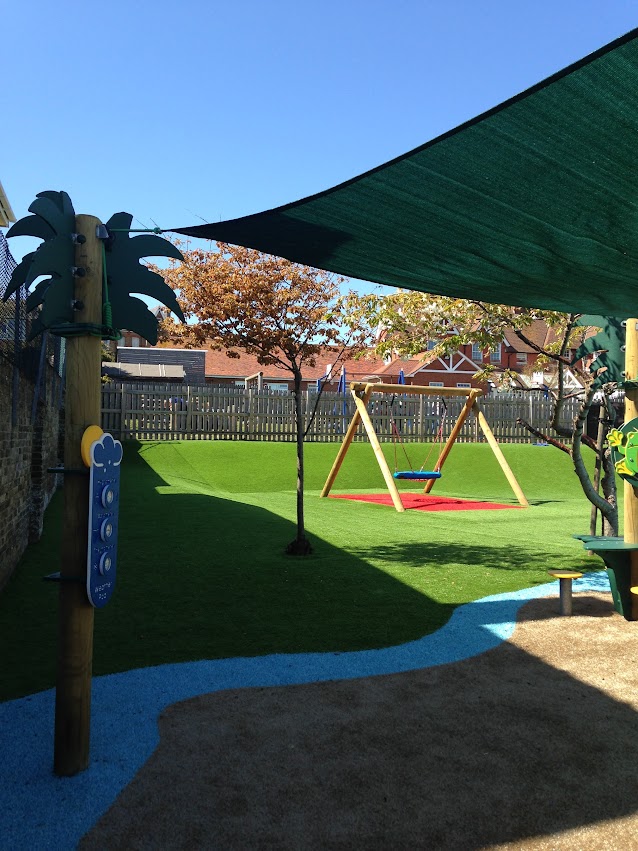 for ball sports and athletic activities, a play area where our young people enjoy riding go-karts and shooting hoops at basketball posts. Artificial grass areas or sheltered decks outside some classrooms allow pupils quiet moments to unwind. Our large ‘basket’ swings are very popular too, and a selection of benches and picnic tables provide places for outdoor eating, reading or just sitting. Other outdoor facilities include a sensory garden and larger garden area we are developing into a Forest School space.
